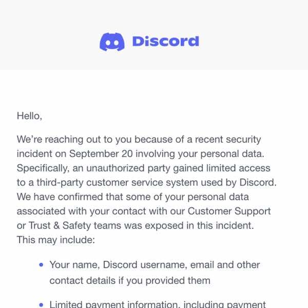 On September 20, 2025, Discord learned that one of its support vendors, a company called 5CA, had been breached.