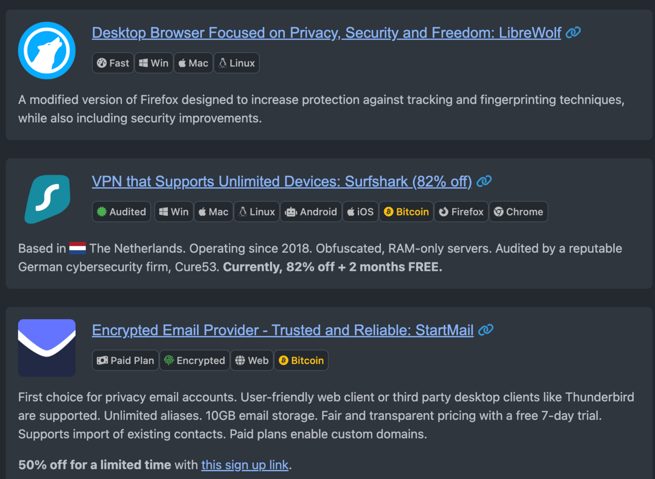 It’s a community-curated list of privacy-first tools. Apps and services that respect your data and don’t secretly track everything you do.