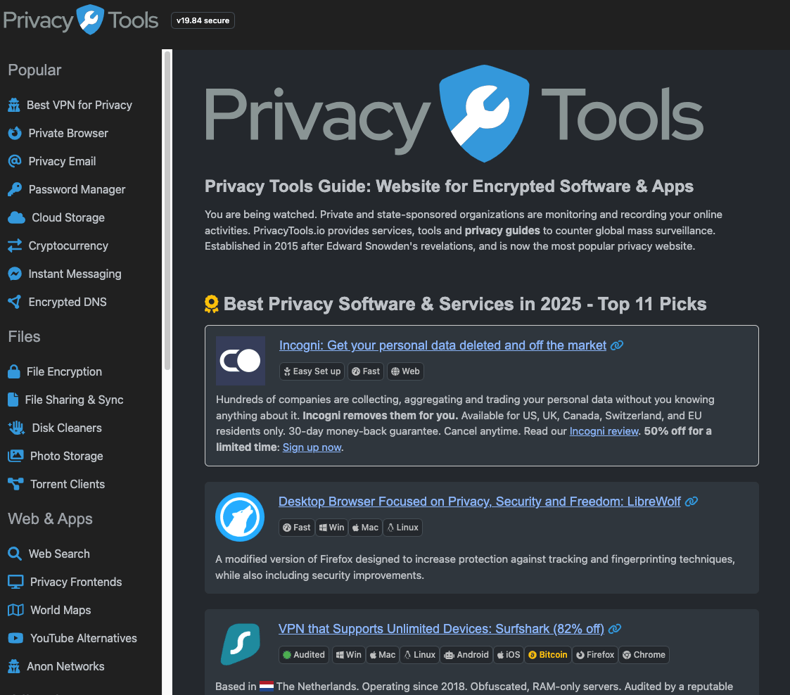 The site originally started in 2013 as a simple GitHub project, built by privacy advocates who wanted to make it easier for people to find ethical tech tools. Over time, it grew into one of the most well-known privacy resources online. While it doesn’t publicly track exact visitor counts, PrivacyTools.io has been featured in tech forums and privacy communities with millions of visitors over the years, and is maintained by an open-source community of contributors around the world.